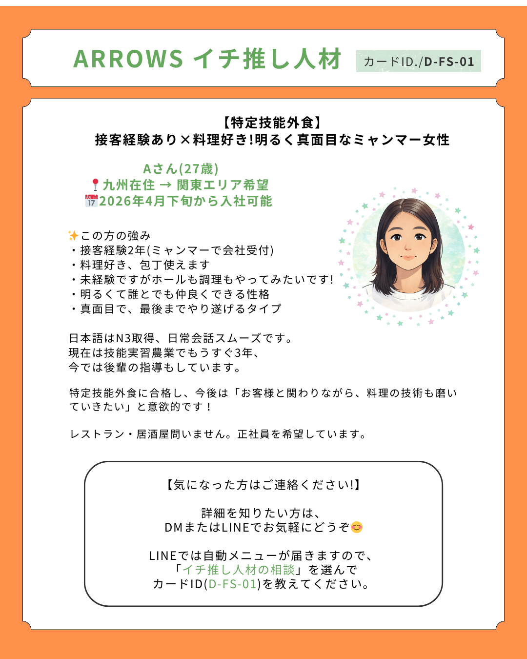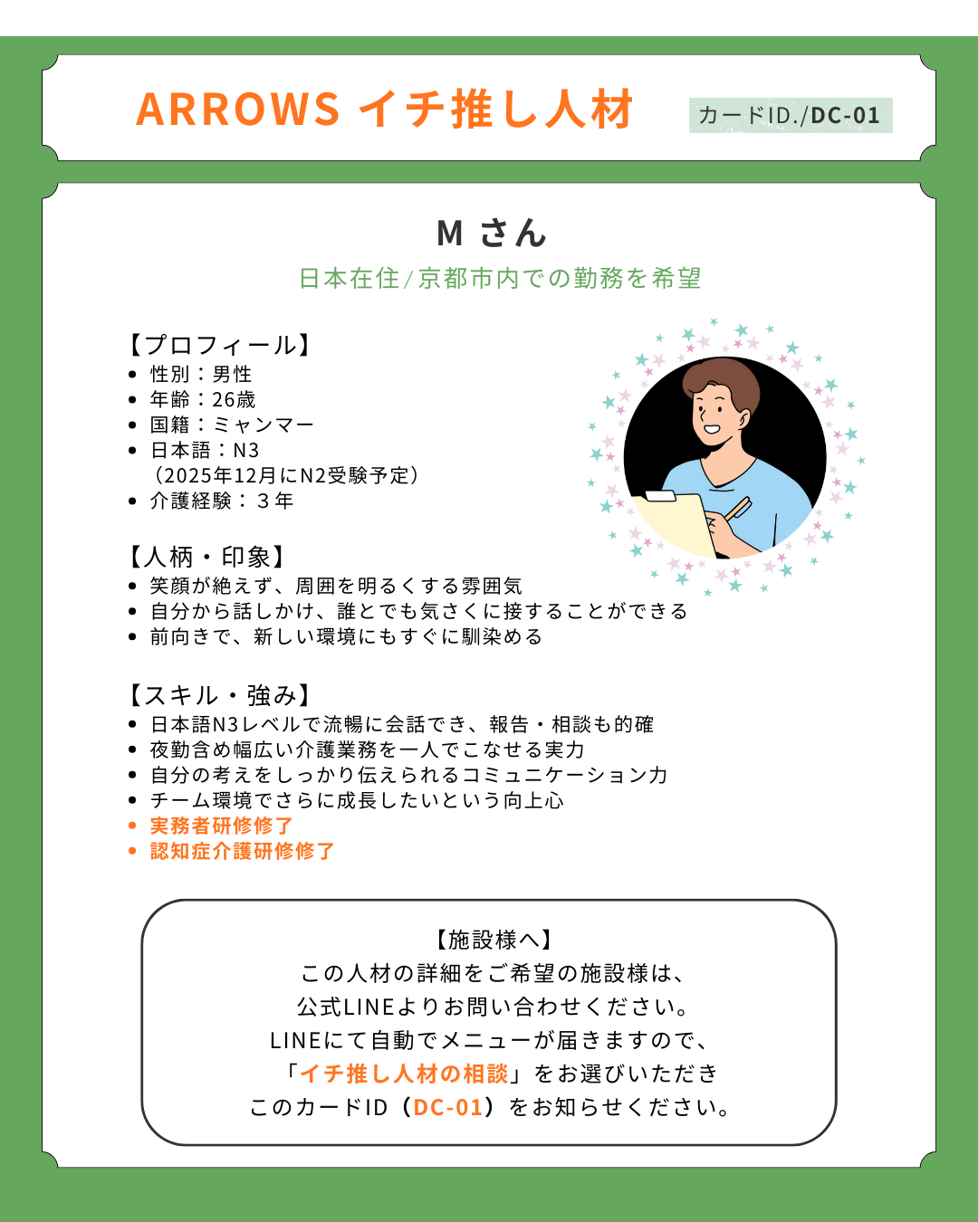 個人情報保護の観点から、カードではイチ推しポイントのみ掲載しています。経歴や資格などの詳細は、お問い合わせ後にお伝えしていますので、気になる方がいればLINEからお気軽にお問い合わせください。